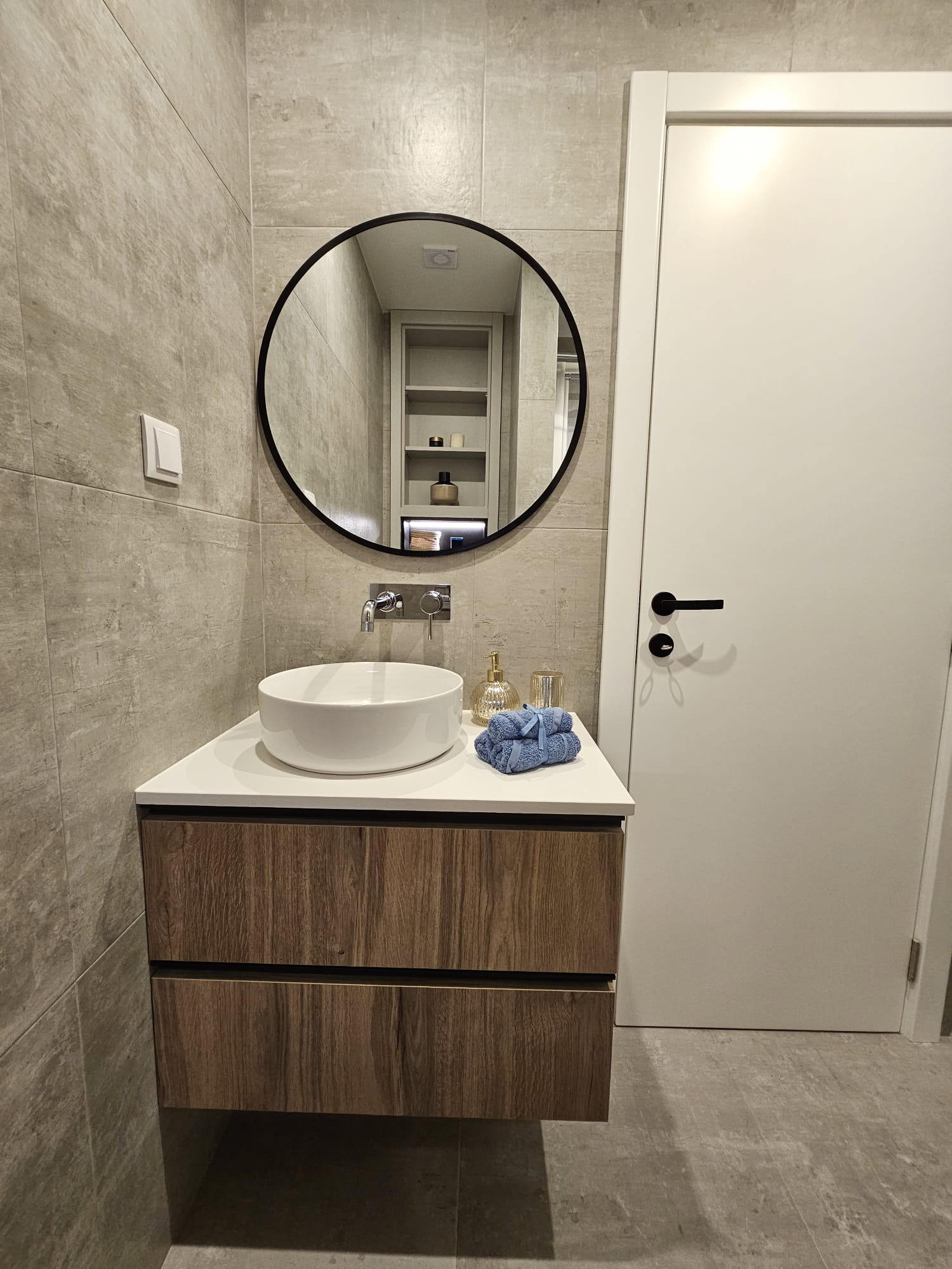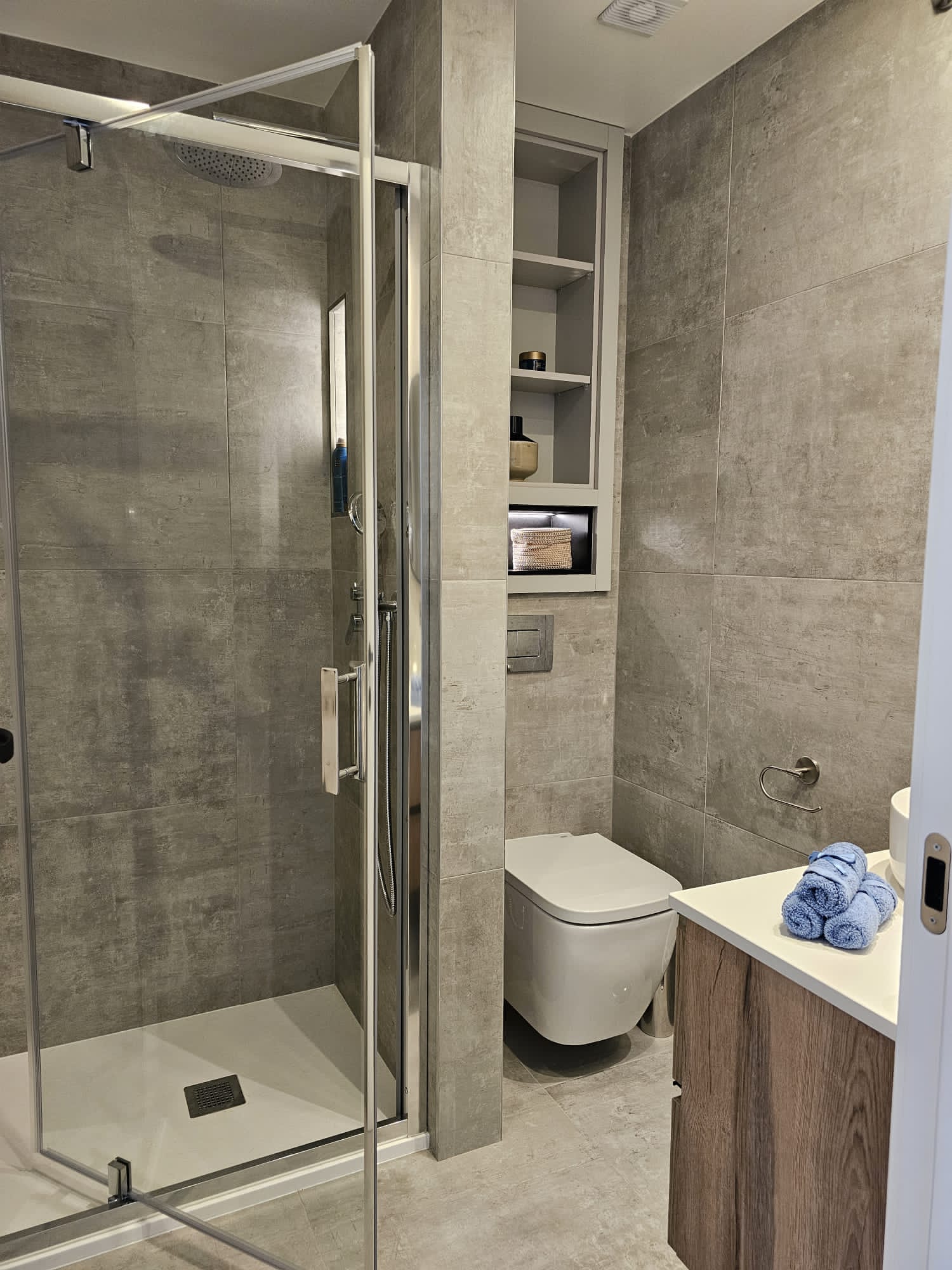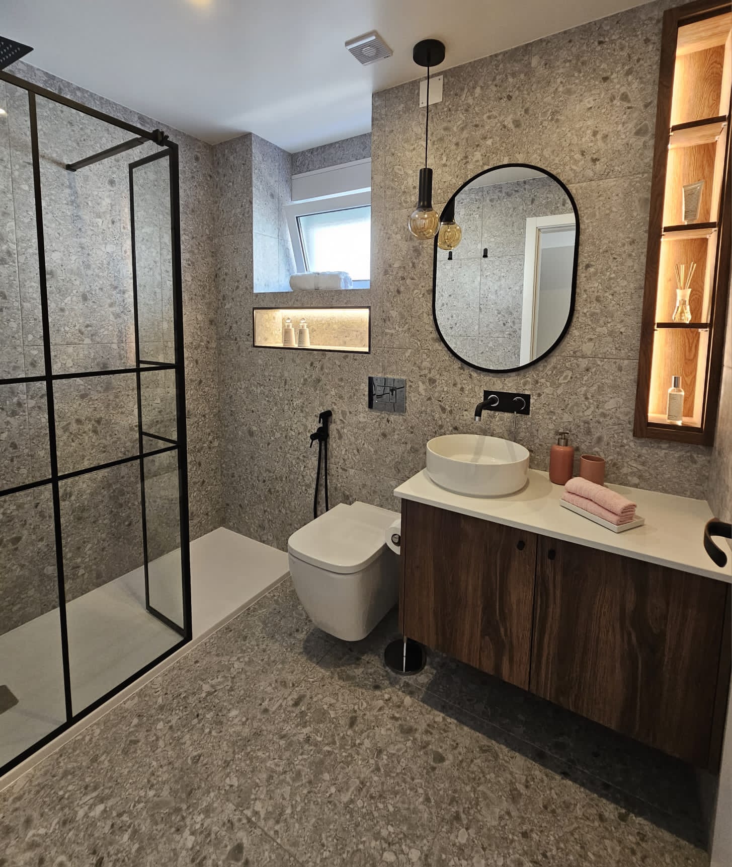 - Caixilharias em alumínio com rutura térmica, janelas com vidro duplo oscilobatente e estores elétricos